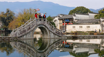 12月9日,在安徽省黄山市黟县宏村,何继星(中)在和学员商量花灯表演巡游路线。