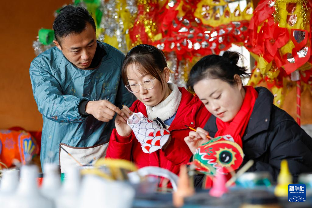 12月9日,在安徽省黄山市黟县宏村,何继星(左)在指导学员制作花灯。