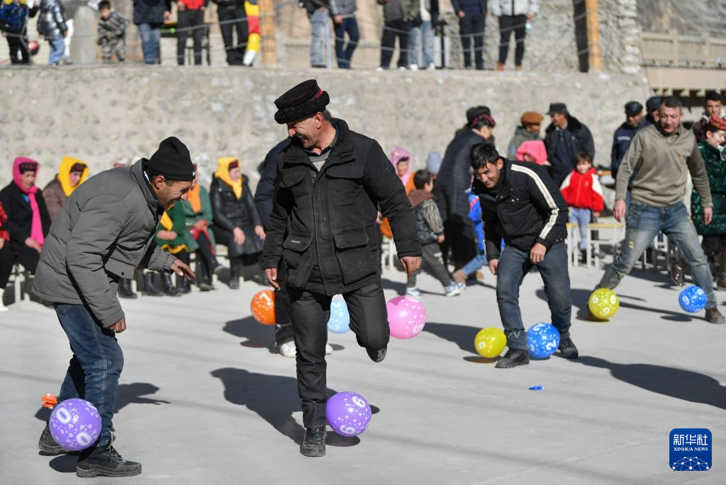 村民在大同乡阿依克日克村的小广场上参与踩气球互动游戏(1月7日摄)。