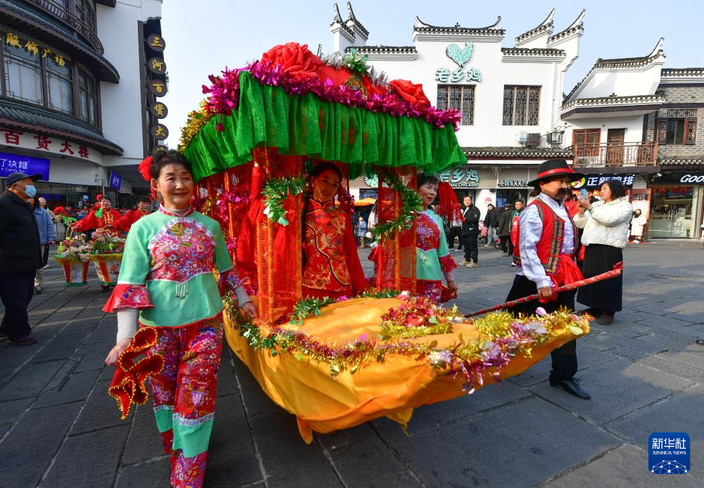 1月22日,民俗表演队伍在安徽省肥西县三河镇表演闹花船。