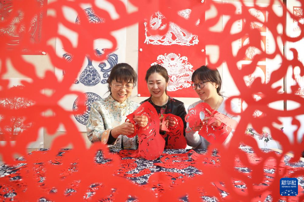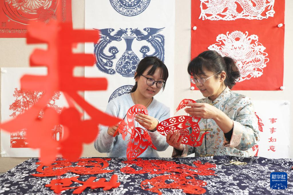 1月22日,在河北省唐山市丰润区太平路街道冀新社区,剪纸艺人葛英(右)在教居民创作生肖蛇剪纸作品。