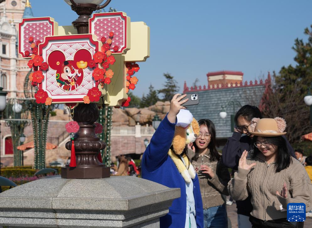 1月22日,在上海迪士尼乐园,游客与穿着中式新装的唐老鸭和黛丝合影。