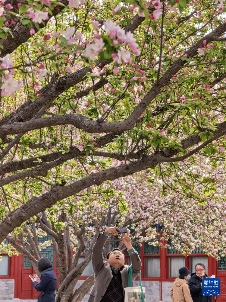 3月31日,游客在恭王府内欣赏海棠。