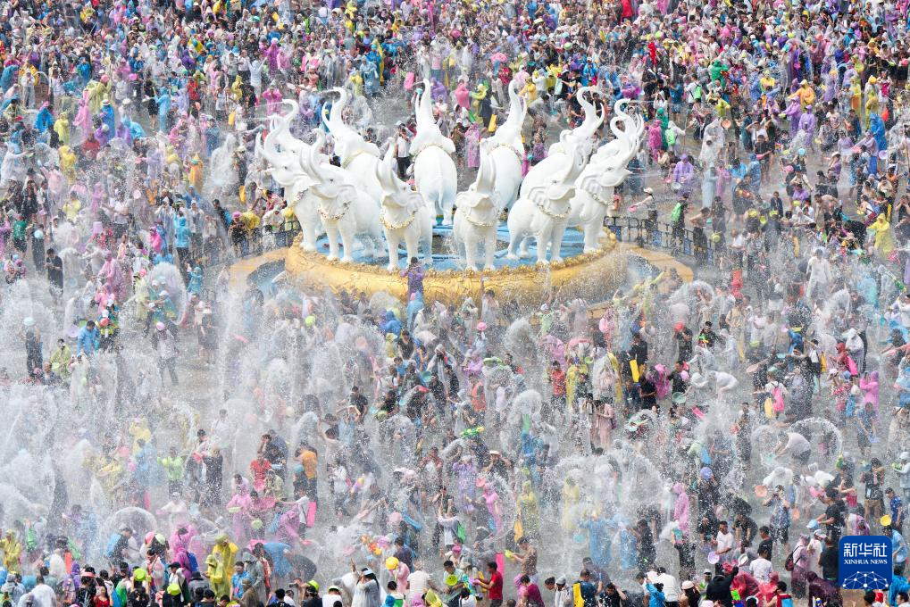 4月15日,人们在云南省西双版纳傣族自治州景洪市泼水广场泼水狂欢。