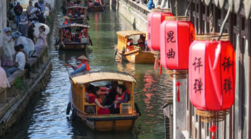 5月15日,游客在位于海南保亭的槟榔谷波隆民俗博物馆观看黎族独木舟。