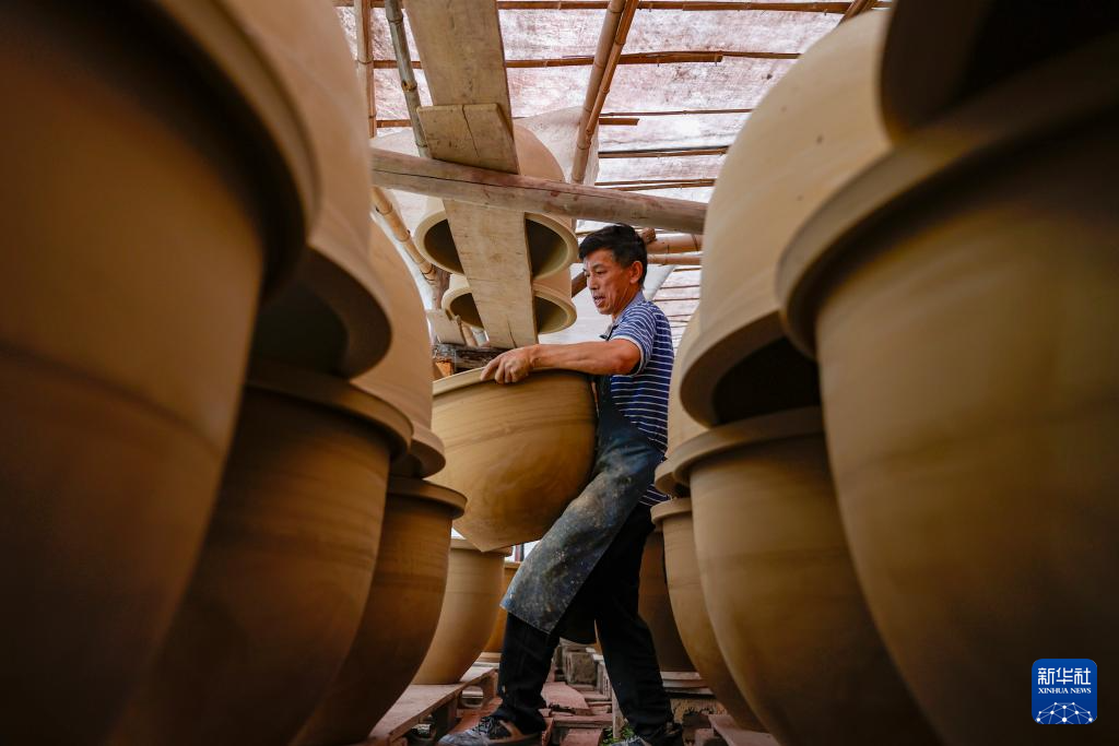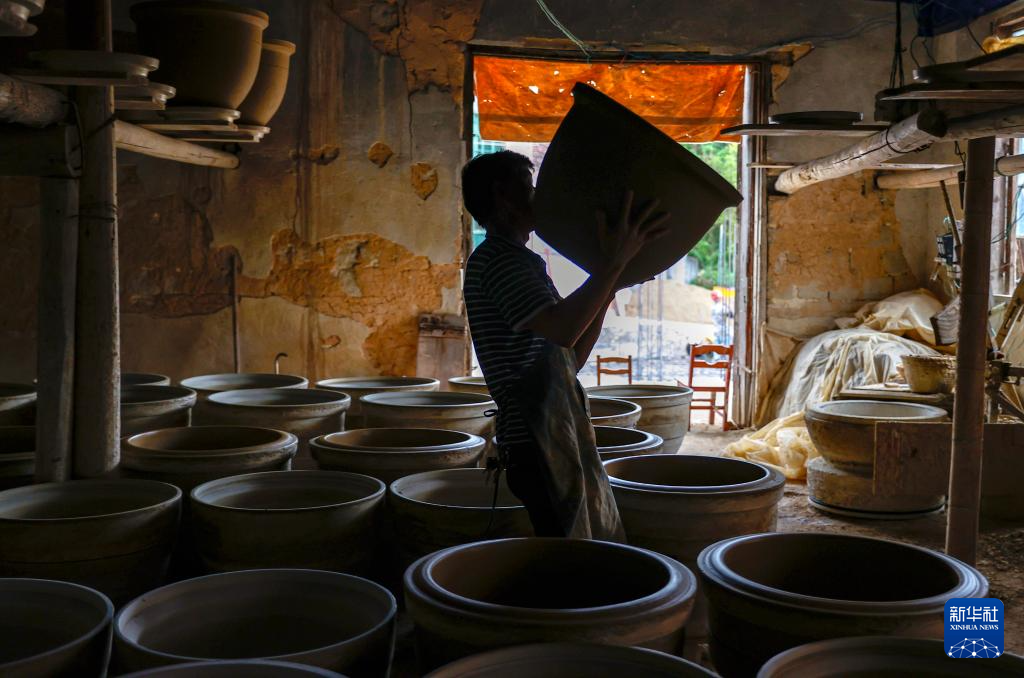 6月17日,制陶师傅方建飞在桂东县普乐镇陶瓷作坊搬运晒干的陶器。