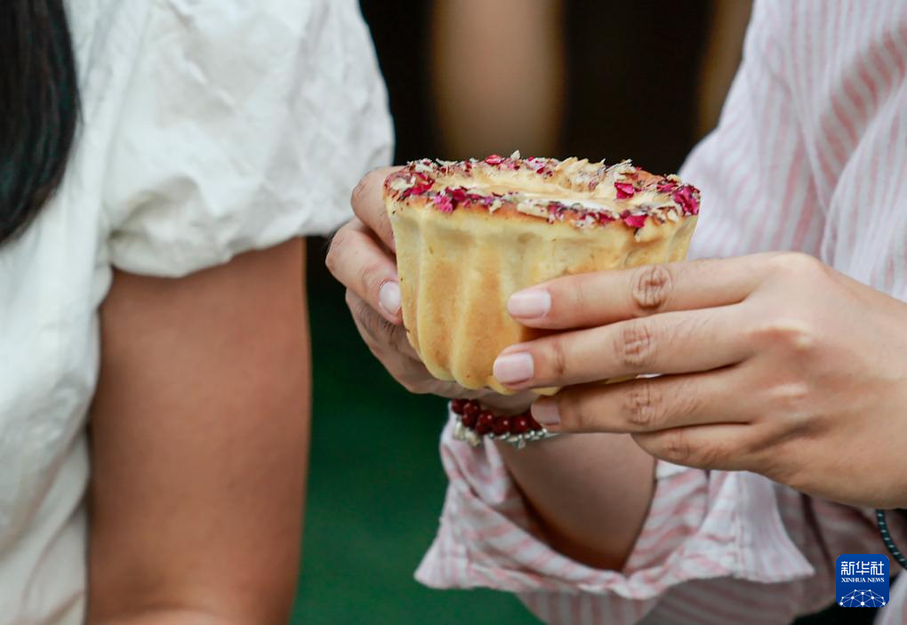 7月23日,在乌鲁木齐大巴扎步行街,游客在品尝馕咖啡。