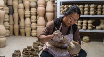 11月7日,一名手工艺人在巴基斯坦首都伊斯兰堡举办的民俗文化节上制作工艺品。