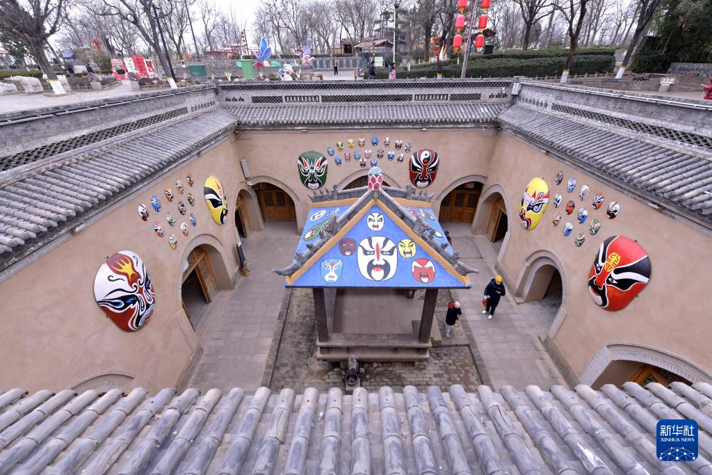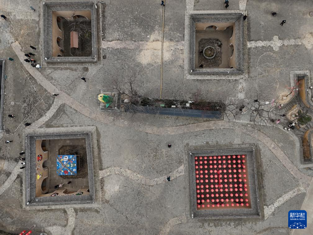 12月21日,河南省三门峡市陕州区张汴乡北营村地坑院民俗表演吸引游客观看(无人机照片)。