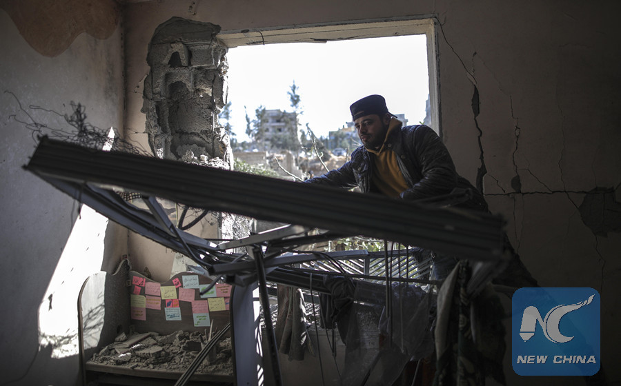 A Palestinian checks his damaged house in Beit Lahia town, northern Gaza Strip, on Dec. 9, 2017. Israeli war jets carried out airstrikes at around 3:45 am Saturday. They struck with missiles three military posts that belong to Hamas in northern, central and southern Gaza Strip. (Xinhua Photo)