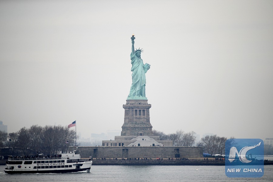 Tourists visit the Statue of Liberty on Liberty Island in New York, the United States, Jan. 22, 2018. New York City's iconic landmark the Statue of Liberty reopened Monday at the expense of state funds following a brief closure as a result of the U.S. federal government shutdown. (Xinhua/Wang Ying)