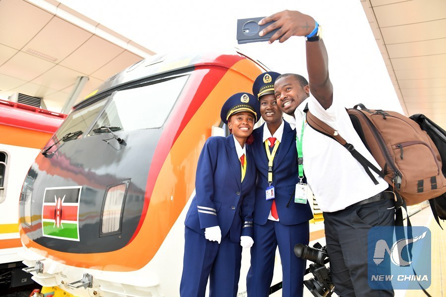 A Kenyan journalist poses for selfies with female train driver Concilia (C) and Alice (L) during the launching day of the Mombasa-Nairobi railway in Mombasa, Kenya, May 31, 2017. (Xinhua/Sun Ruibo)