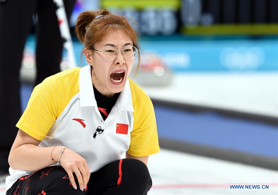 China's Liu Jinli competes during women's round robin event of curling against Canada at 2018 PyeongChang Winter Olympic Games at Gangneung Curling Centre, Gangneung, South Korea, Feb. 20, 2018. China won 7:5. (Xinhua/Ma Ping)