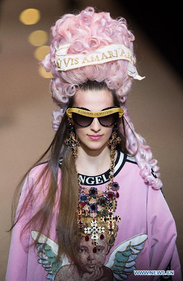 A model presents a creation of Dolce&Gabbana "Fashion Devotion" Autumn/Winter?18/19 women's collection during Milan Fashion Week in Milan, Italy, Feb. 25, 2018. (Xinhua/Jin Yu)