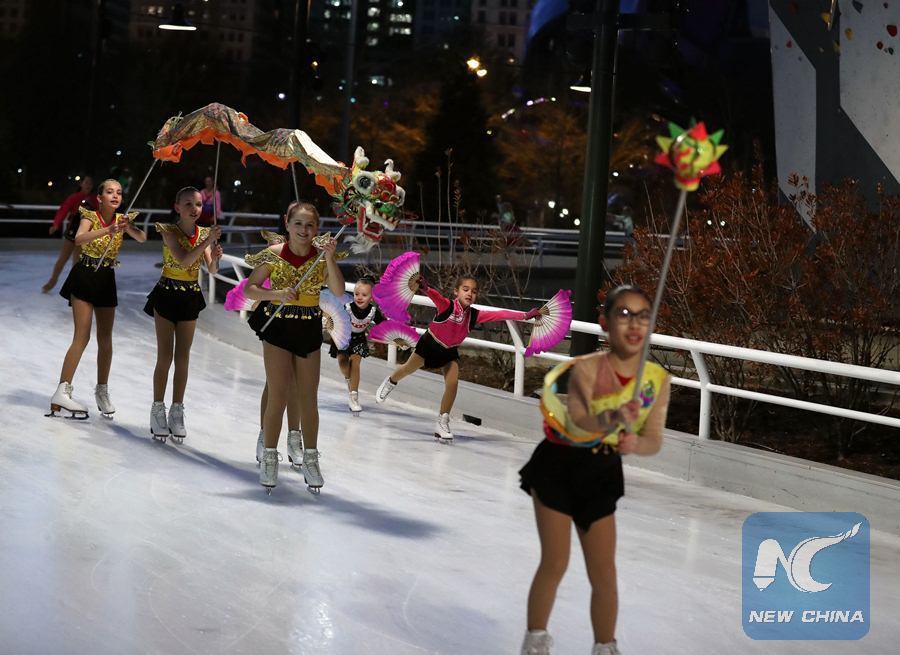 Children perform figure skating during the Lantern Celebration Event in Chicago, the United States, on March 3, 2018. (Xinhua/Wang Ping)