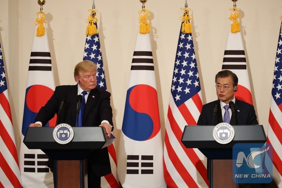 U.S. President Donald Trump (L) and South Korean President Moon Jae-in attend a press conference at the presidential residence in Seoul, South Korea, Nov. 7, 2017. (Xinhua/POOL)