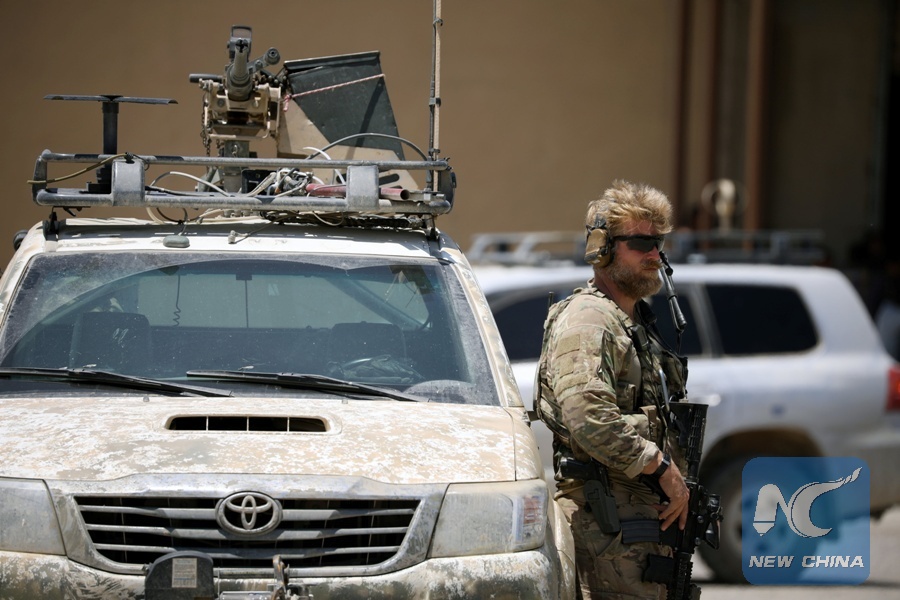 U.S army soldier holds a gun as he stands guard next to an armoured vehicle as Brett McGurk, U.S. envoy to the coalition against Islamic State, visits the town of Tabqa, Syria June 29, 2017. (Xinhua/REUTERS)
