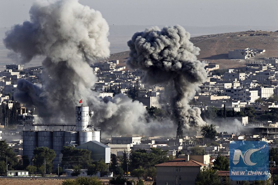 Smoke rises after a U.S. air strike on Islamic State terrorist group in Kobani, Syria, Oct. 11, 2014. (Xinhua/Cihan)