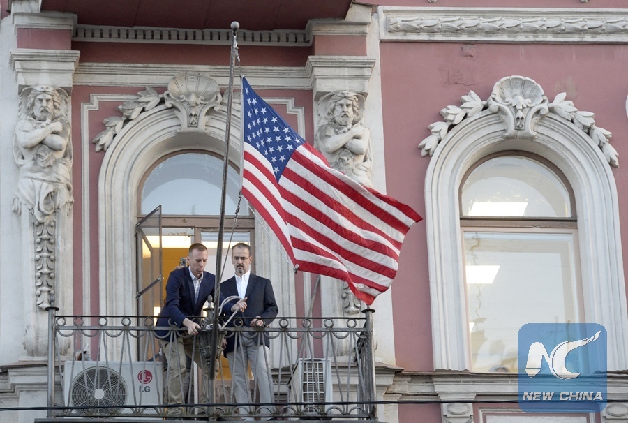 U.S. consulate's employees remove the U.S. national flag from the balcony of the U.S. Consulate in Saint Petersburg on March 31, 2018. (Xinhua/AFP)