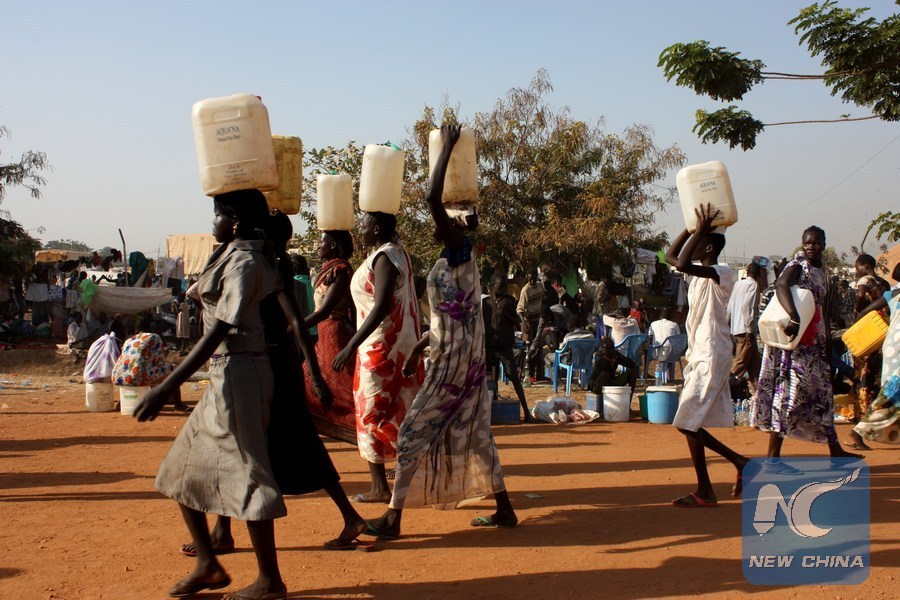 South Sudanese women carry water in a UN camp in Juba, capital of South Sudan, Dec. 22, 2013. (Xinhua/Lu Rui)