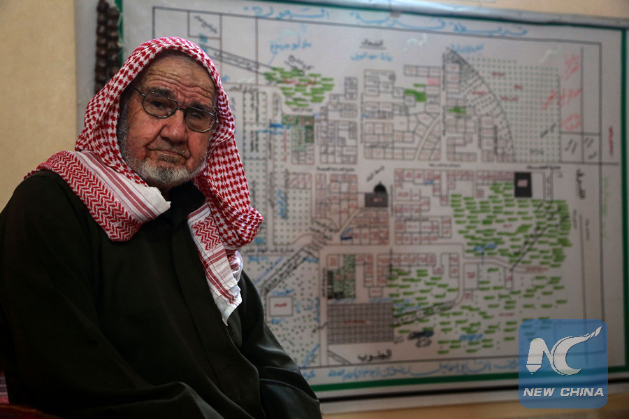 80-year-old Palestinian refugee Suleiman Radwan, sits in front of a map showing his birthplace Joarat Askalan village inside his house in a refugee camp in Gaza Strip. (Xinhua)