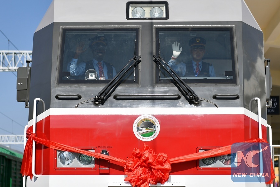 Chinese train driver Liu Ji (R) and his Ethiopian colleague Geto wave hands before the start of the first passenger train of the Addis Ababa-Djibouti railway in Addis Ababa, Ethiopia, on Oct. 5, 2016.(Xinhua/Sun Ruibo)