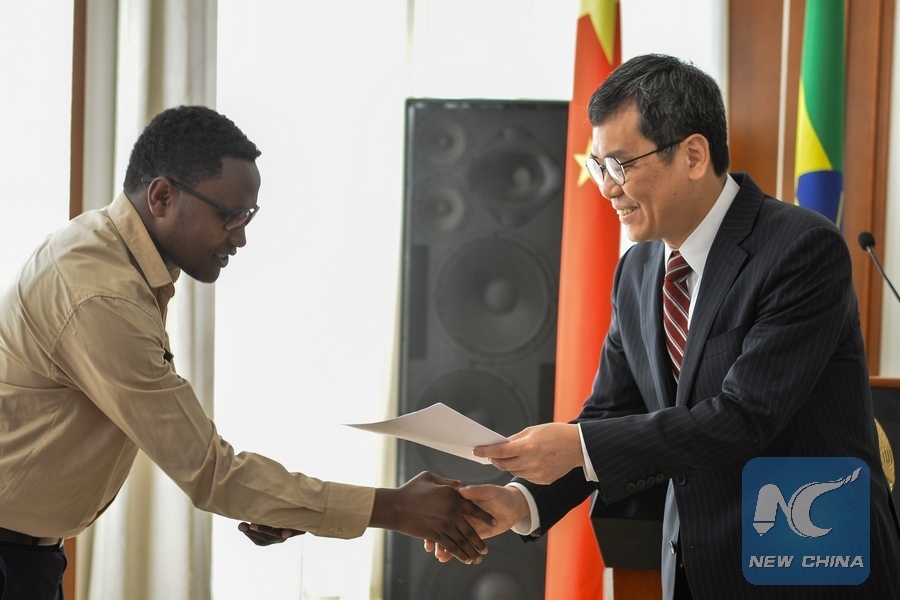 Tan Jian (R), Chinese Ambassador to Ethiopia awards an Ethiopian student a scholarship in Addis Ababa, capital of Ethiopia, Aug. 8, 2018. (Xinhua/Michael Tewelde)