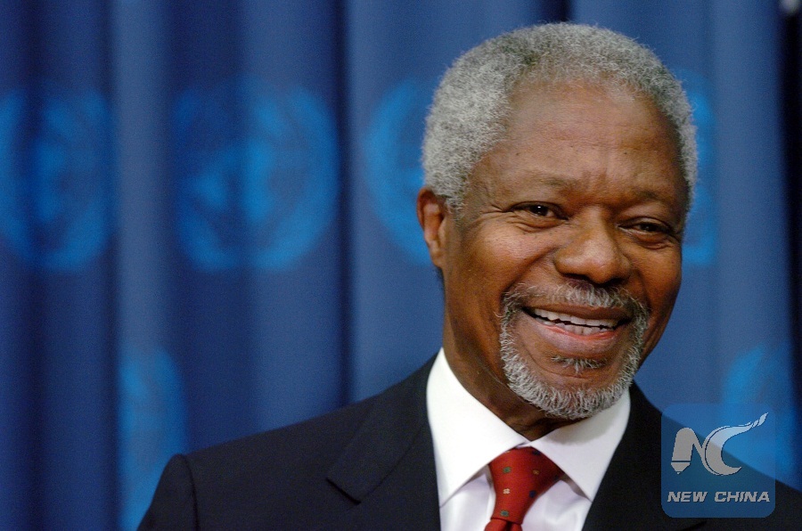 File photo taken on Dec. 19, 2006 shows then UN Secretary-General Kofi Annan smiling during his final press conference at the United Nations headquarters in New York. (Xinhua/Zhao Peng)