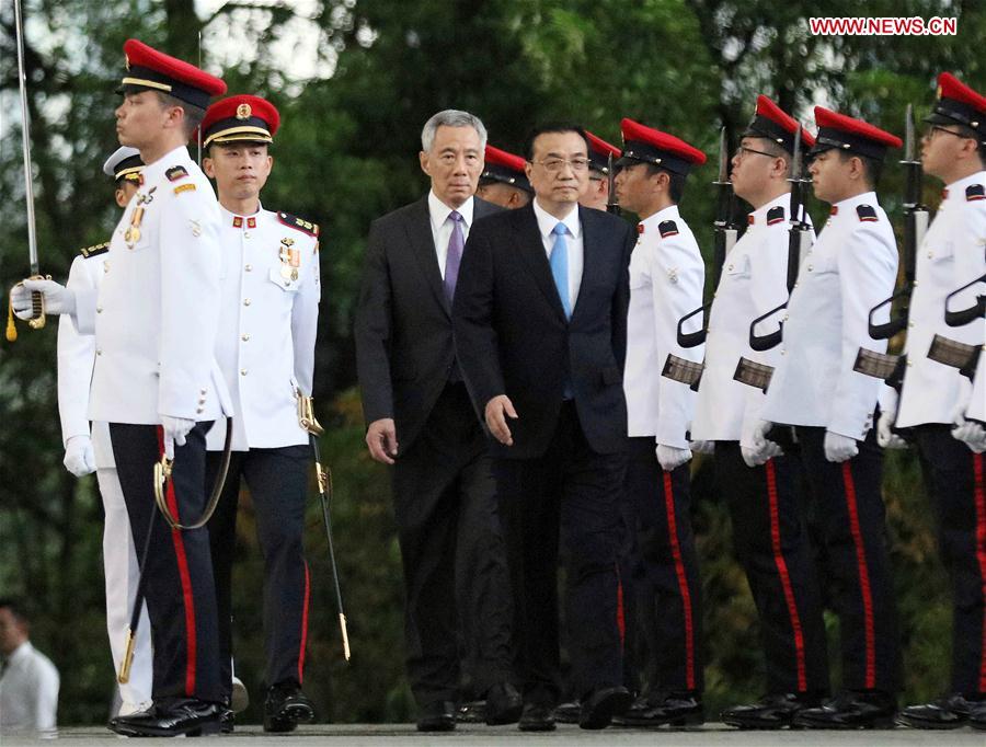 Chinese Premier Li Keqiang attends a welcome ceremony held by Singaporean Prime Minister Lee Hsien Loong before their talks in Singapore, Nov. 12, 2018. (Xinhua/Liu Weibing)