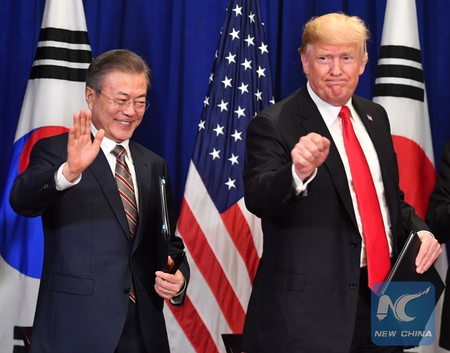 File Photo: U.S. President Donald Trump (R) and South Korean President Moon Jae-in gesture after signing a trade agreement at a bilateral meeting in New York on September 24, 2018, a day before the start of the General Debate of the 73rd session of the General Assembly. (Xinhua/AFP)