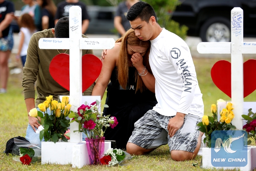 File Photo: Mourners pray at a makeshift memorial left in memory of the victims killed in a shooting at Santa Fe High School in Santa Fe, Texas, U.S., May 21, 2018. (Xinhua/REUTERS)