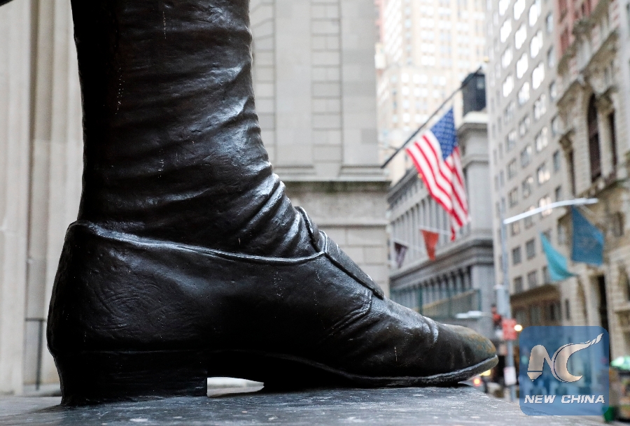 Photo taken on Jan. 12, 2019 shows the statue of George Washington outside the Federal Hall National Memorial, a tourist attraction which is closed due to partial government shutdown, in New York, the United States, Jan. 12, 2019. (Xinhua/Wang Ying)
