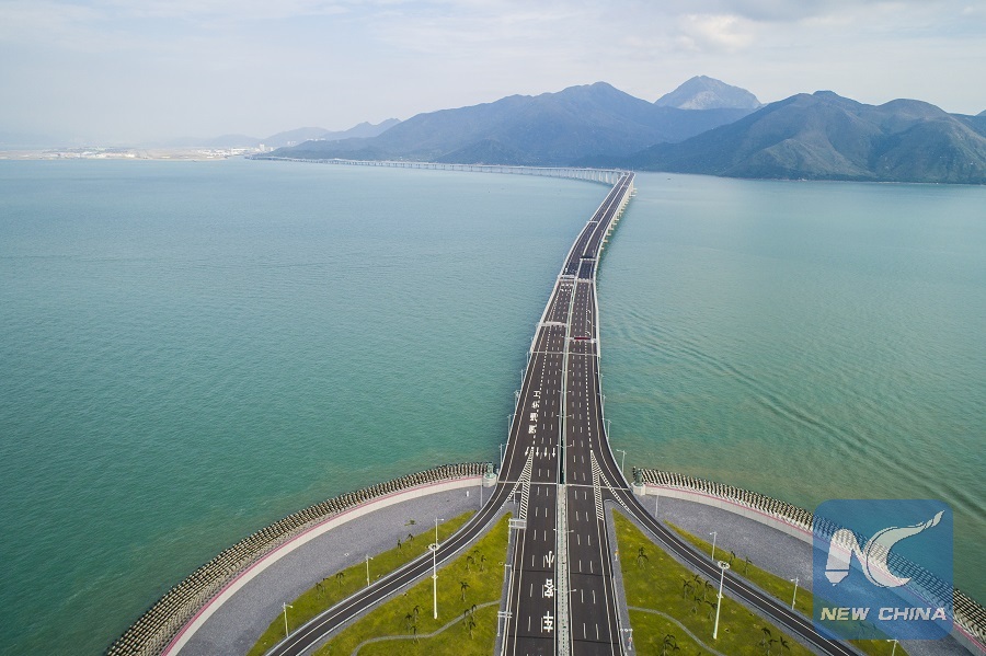 Aerail photo taken on Oct. 13, 2018 shows the Hong Kong section of the Hong Kong-Zhuhai-Macao Bridge in Hong Kong, south China. (Xinhua/Lui Siu Wai)