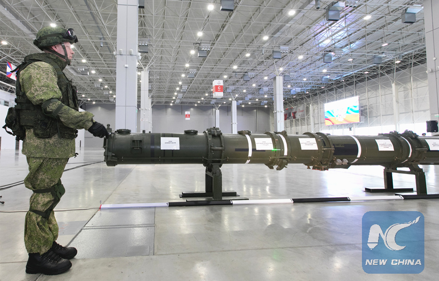 The 9M728 missile container is demonstrated at the Patriot Congress and Exhibition Center, outside Moscow, Russia, on Jan. 23, 2019. (Xinhua/Bai Xueqi)