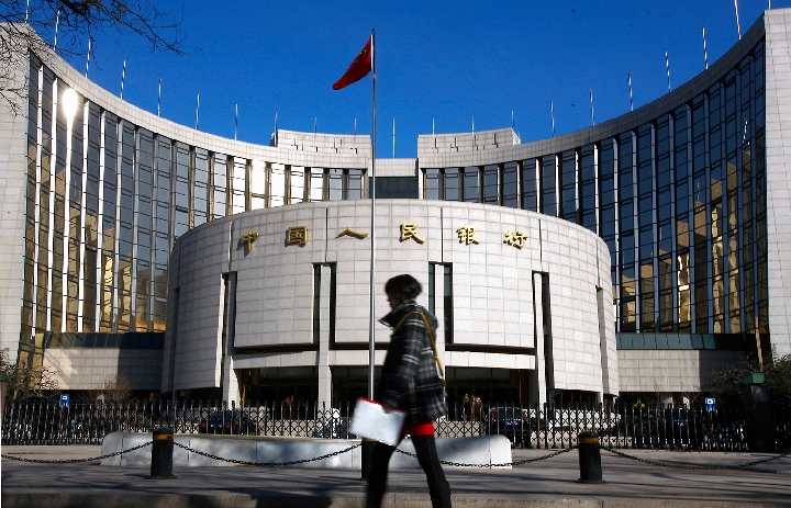 A file photo taken on Feb. 23, 2012 shows a pedestrian walking past the headquarters building of the People's Bank of China in Beijing, capital of China. (Xinhua/Wan Xiang)