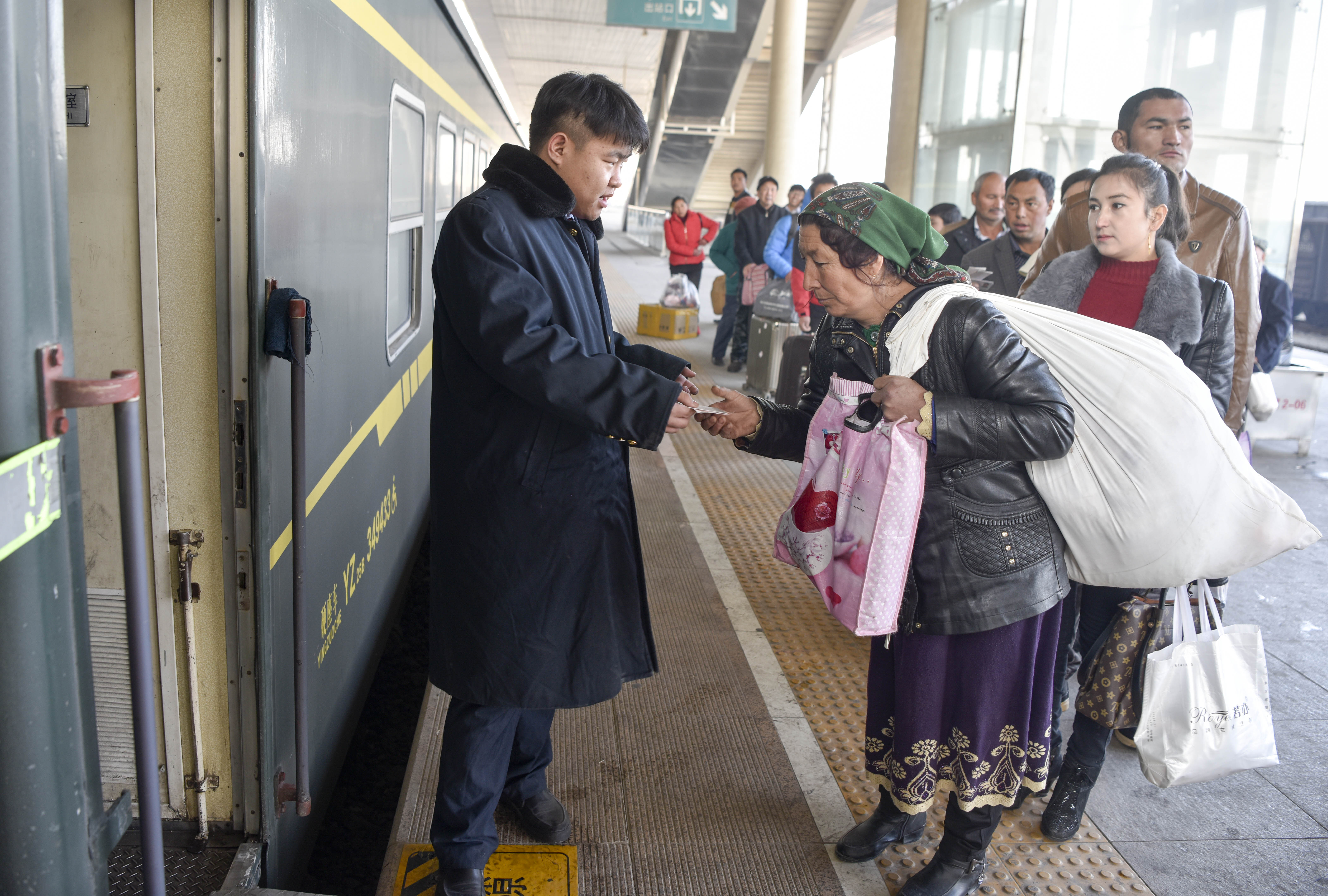 Passengers line to board a train linking Kashgar and Hotan in northwest China's Xinjiang Uygur Autonomous Region, Nov. 25, 2017. (Xinhua/Zhao Ge)