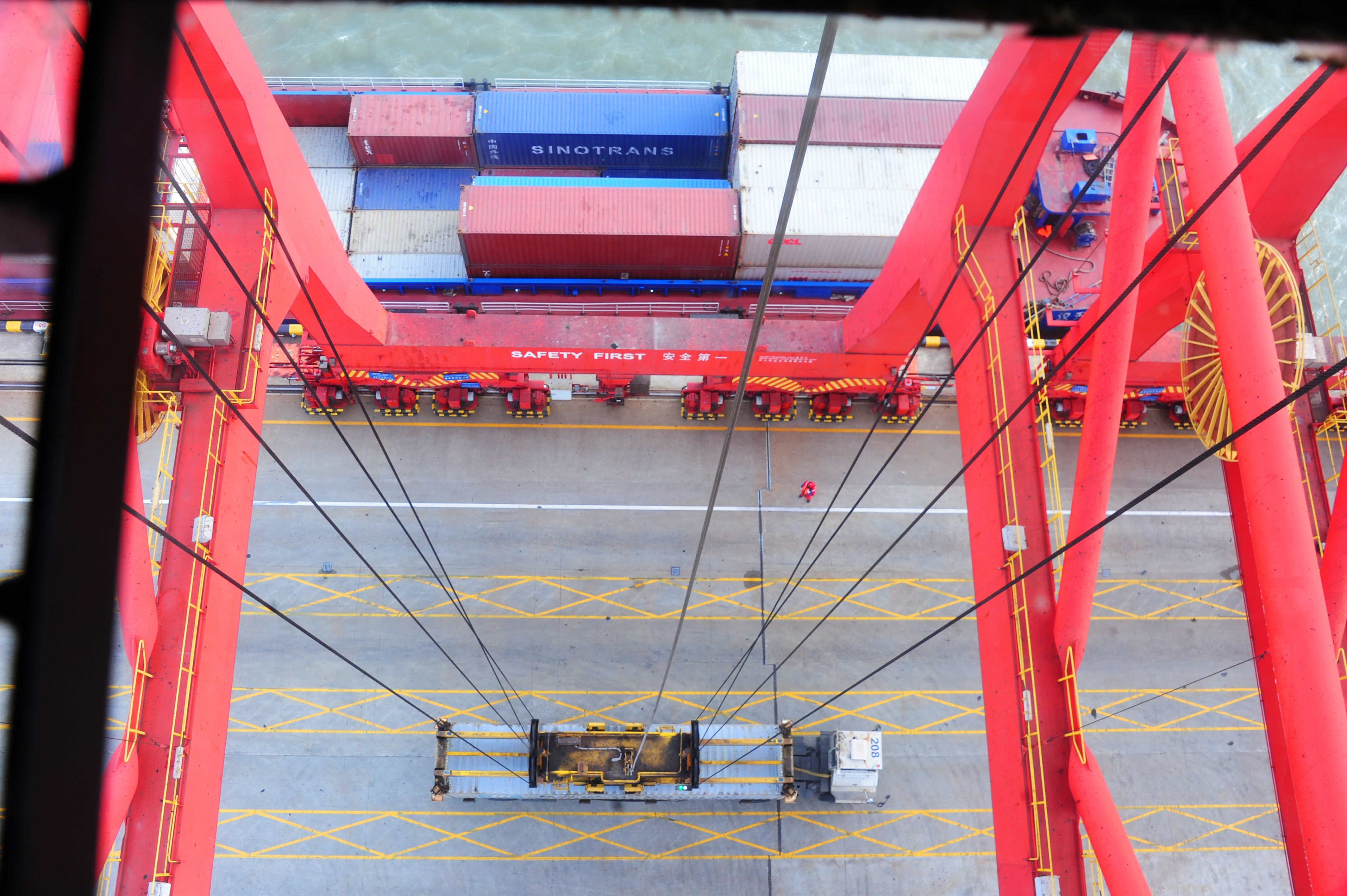 The photo shows the process of container loading by a crane driver at Zhenghe Xinggang Terminals of Taicang Port in Suzhou, east China's Jiangsu Province. (Xinhua/Ji Haixin)