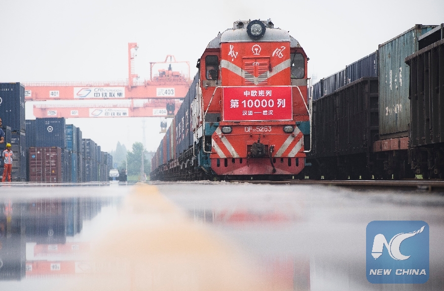 File Photo: The freight train X8044 from Hamburg of Germany arrives at Wujiashan railway container center station in Wuhan, central China's Hubei Province, Aug. 26, 2018. As the freight train X8044 arrived in Wuhan, China-Europe freight trains have made 10,000 trips since 2011. (Xinhua/Xiao Yijiu)