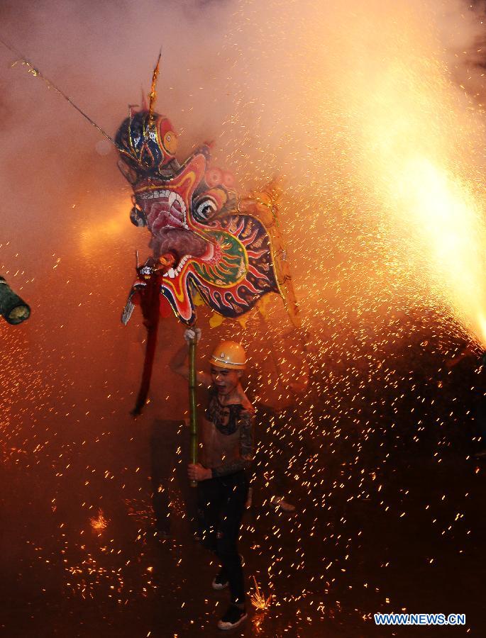 An artist performs dragon dance with fireworks in Majing'ao Town of Jishou City, central China's Hunan Province, Feb. 17, 2019. China will hold the Conference on Dialogue of Asian Civilizations starting from May 15. Under the theme of "exchanges and mutual learning among Asian civilizations and a community with a shared future," the conference includes an opening ceremony and sub-forums. (Xinhua/Yao Fang)