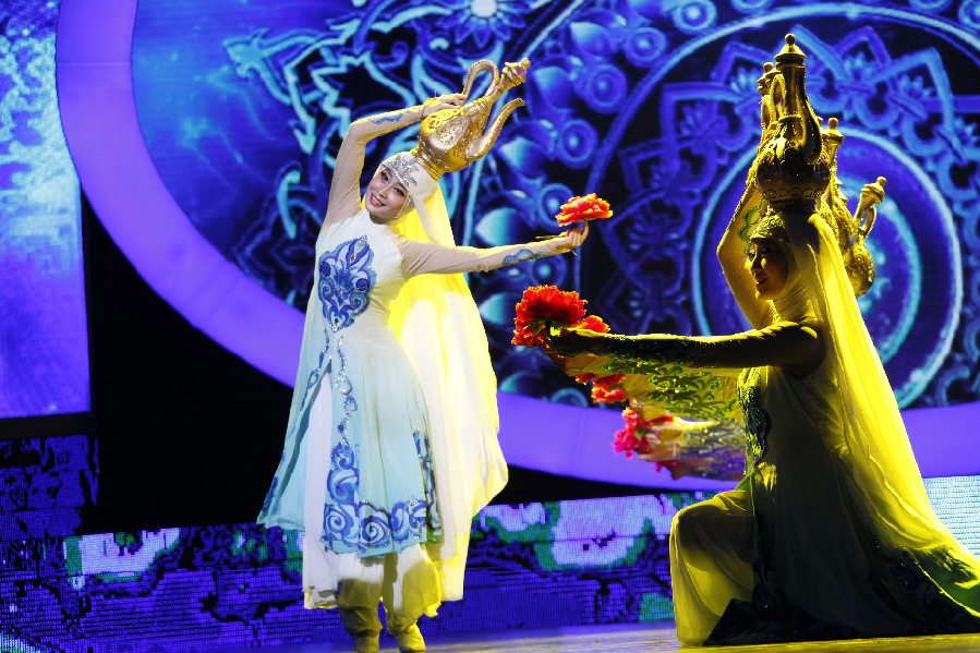 Chinese actresses perform during the opening ceremony of the third Arabic Arts Festival and the Year of China-Arab Friendship at Qinghua University in Beijing, capital of China, Sept. 10, 2014. (Xinhua/Pan Xu)