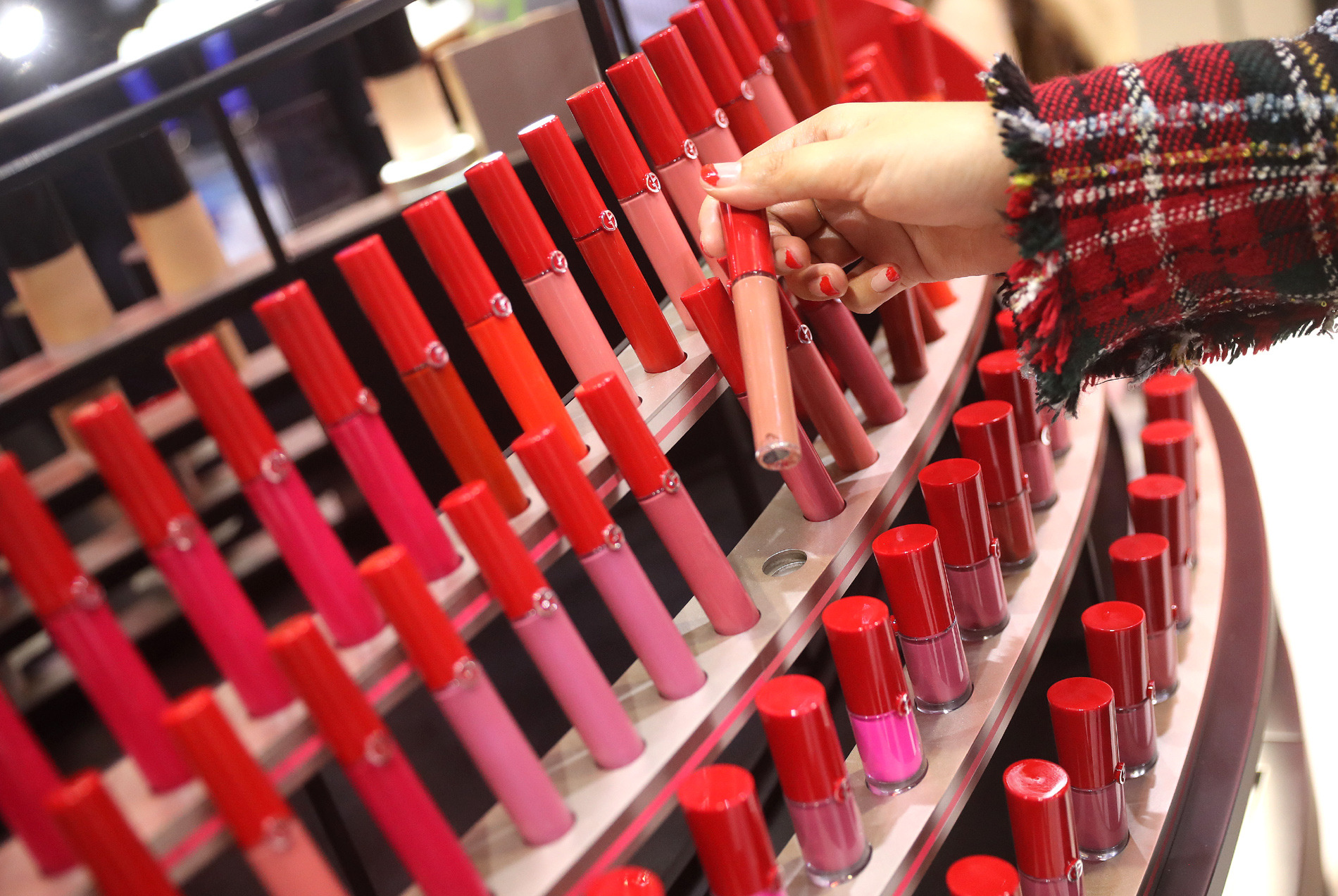 A visitor tries on makeup at the booth of L'Oreal at the first China International Import Expo (CIIE) in Shanghai, east China, Nov. 6, 2018. (Xinhua/Chen Fei)
