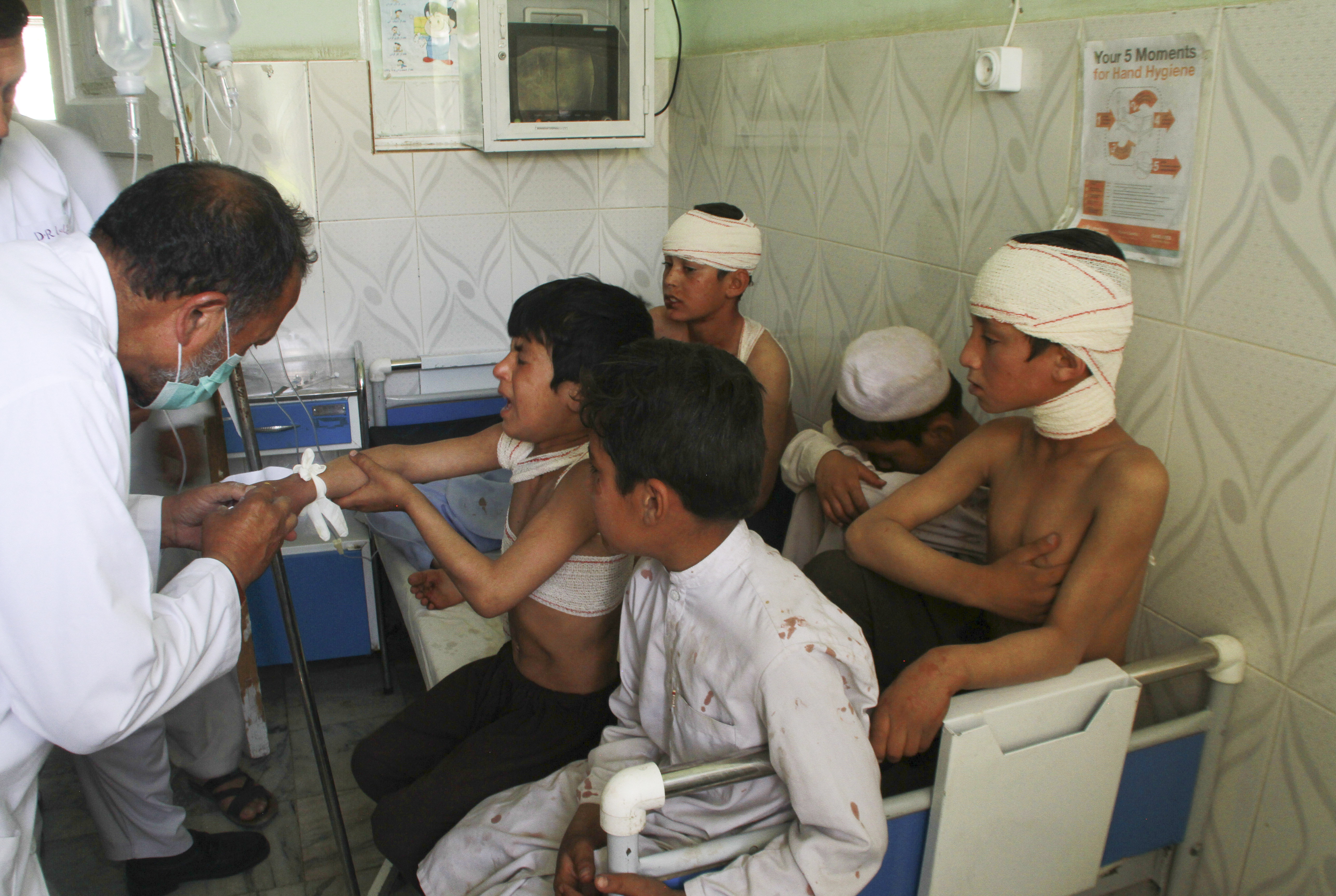 Injured children receive treatment in a hospital after a car bomb attack in Ghazni, Afghanistan, July 7, 2019. (Xinhua/Rohullah)