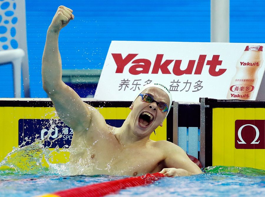 Danas Rapsys of Lithuania celebrates after winning Men's 400m Freestyle Final at 14th FINA World Swimming Championships (25m) in Hangzhou, east China's Zhejiang Province, on Dec. 11, 2018.(Xinhua/Wang Lili)