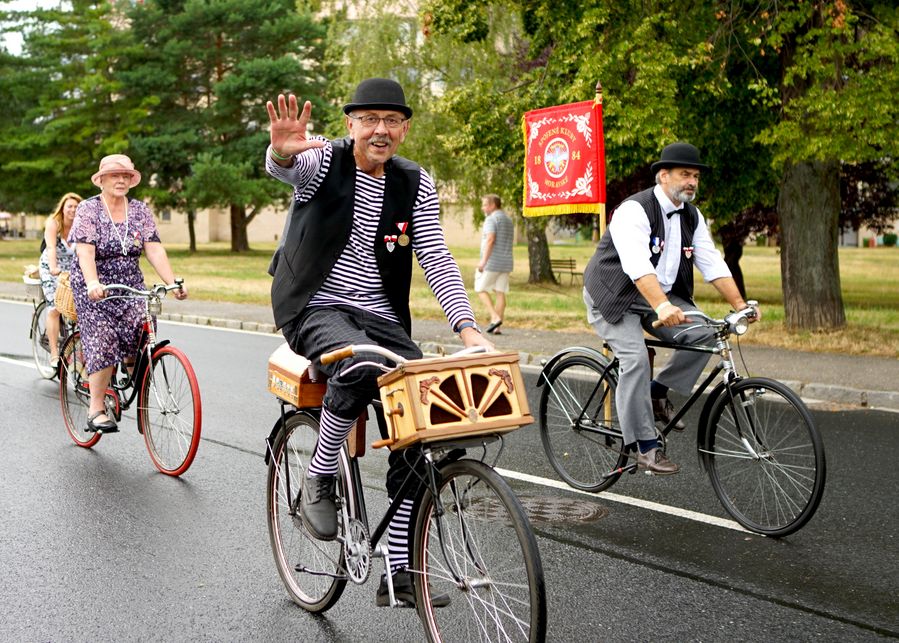 The bicycle ride was organized by the Czech Velocipedists Club. It began at the Tyl Theater, preceded with biking performance with music. The line-up was performed by riders on high wheels.