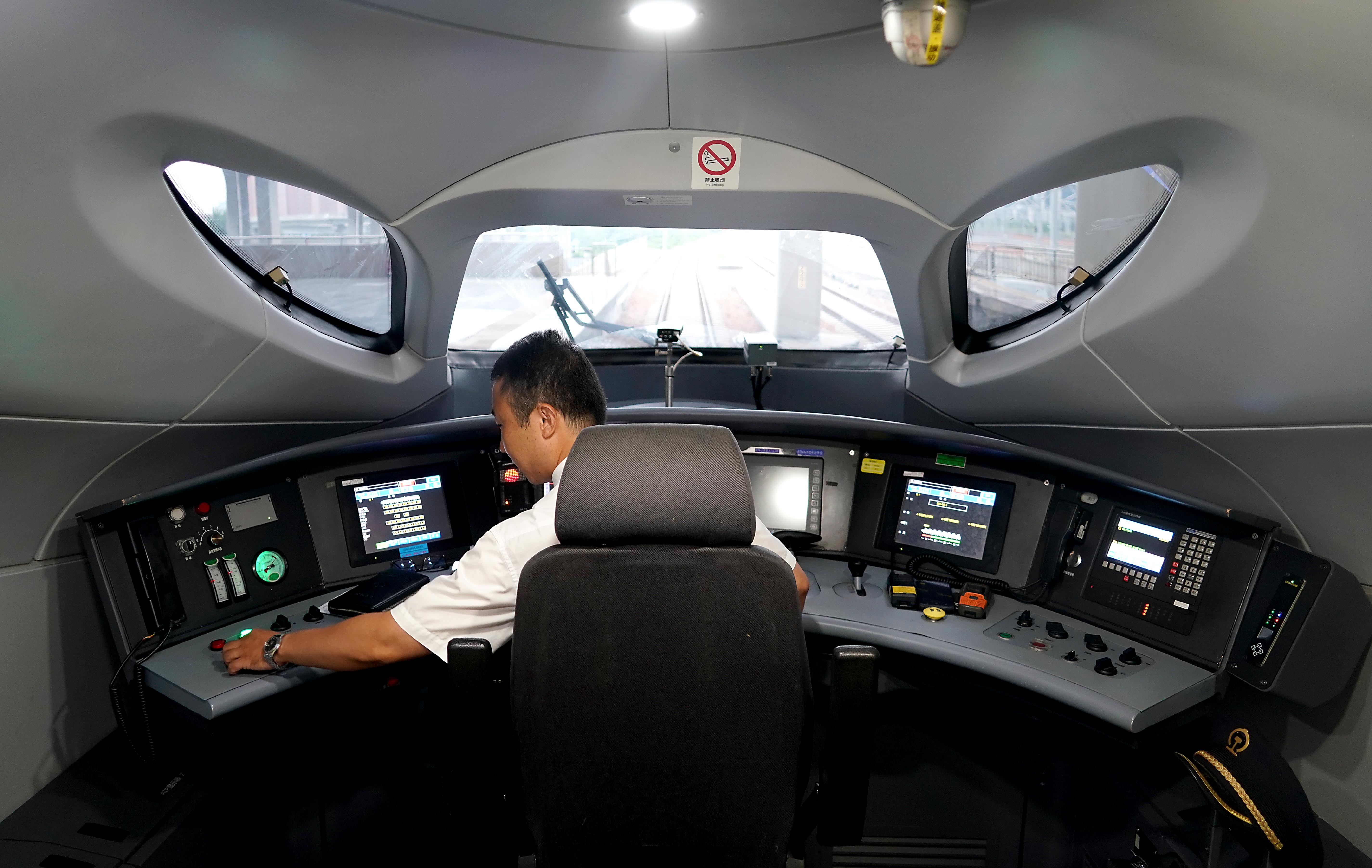 A driver of comprehensive inspection train makes preparation before departure at Zhengzhou East Railway Station in Zhengzhou, central China's Henan Province. (Xinhua/Li An)