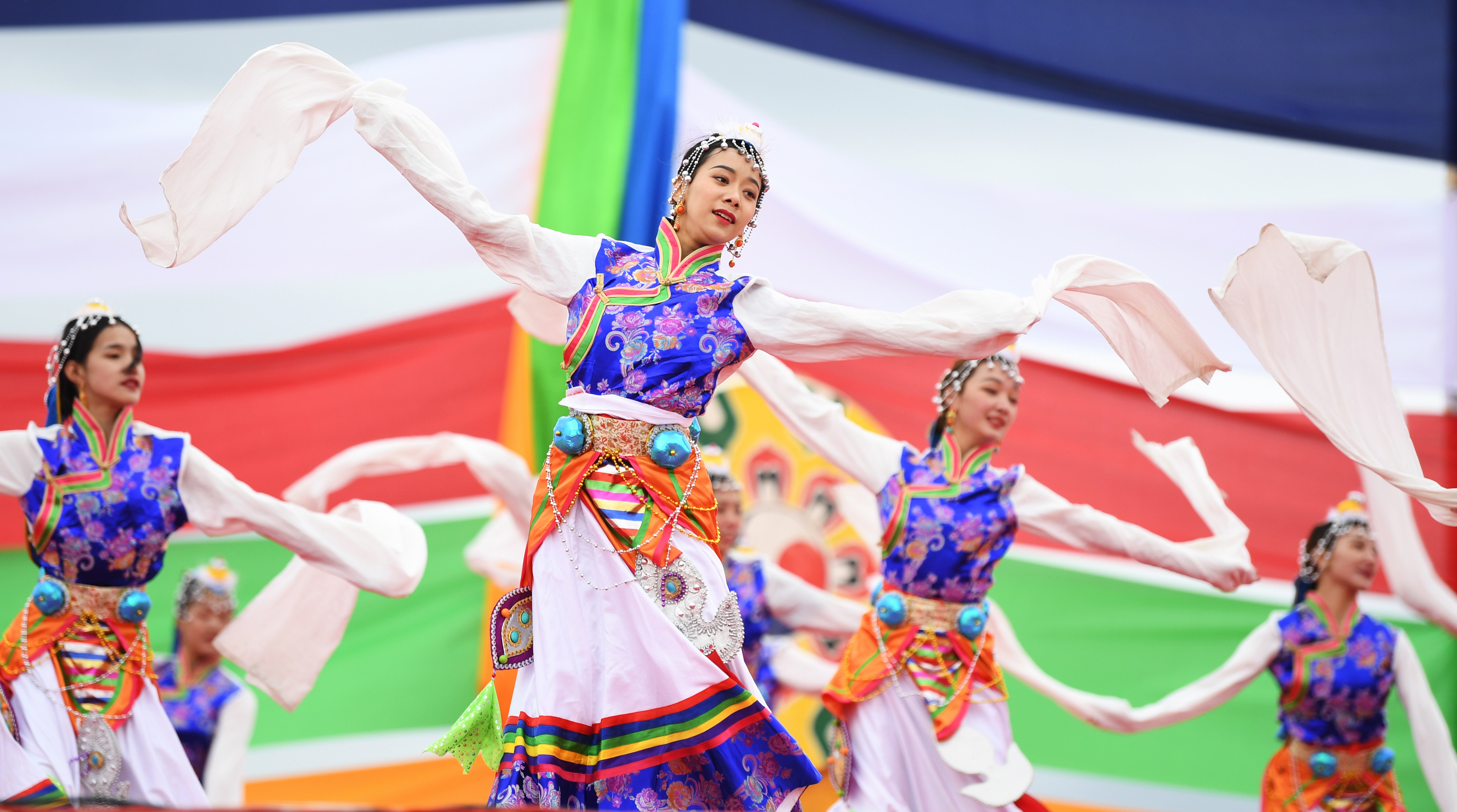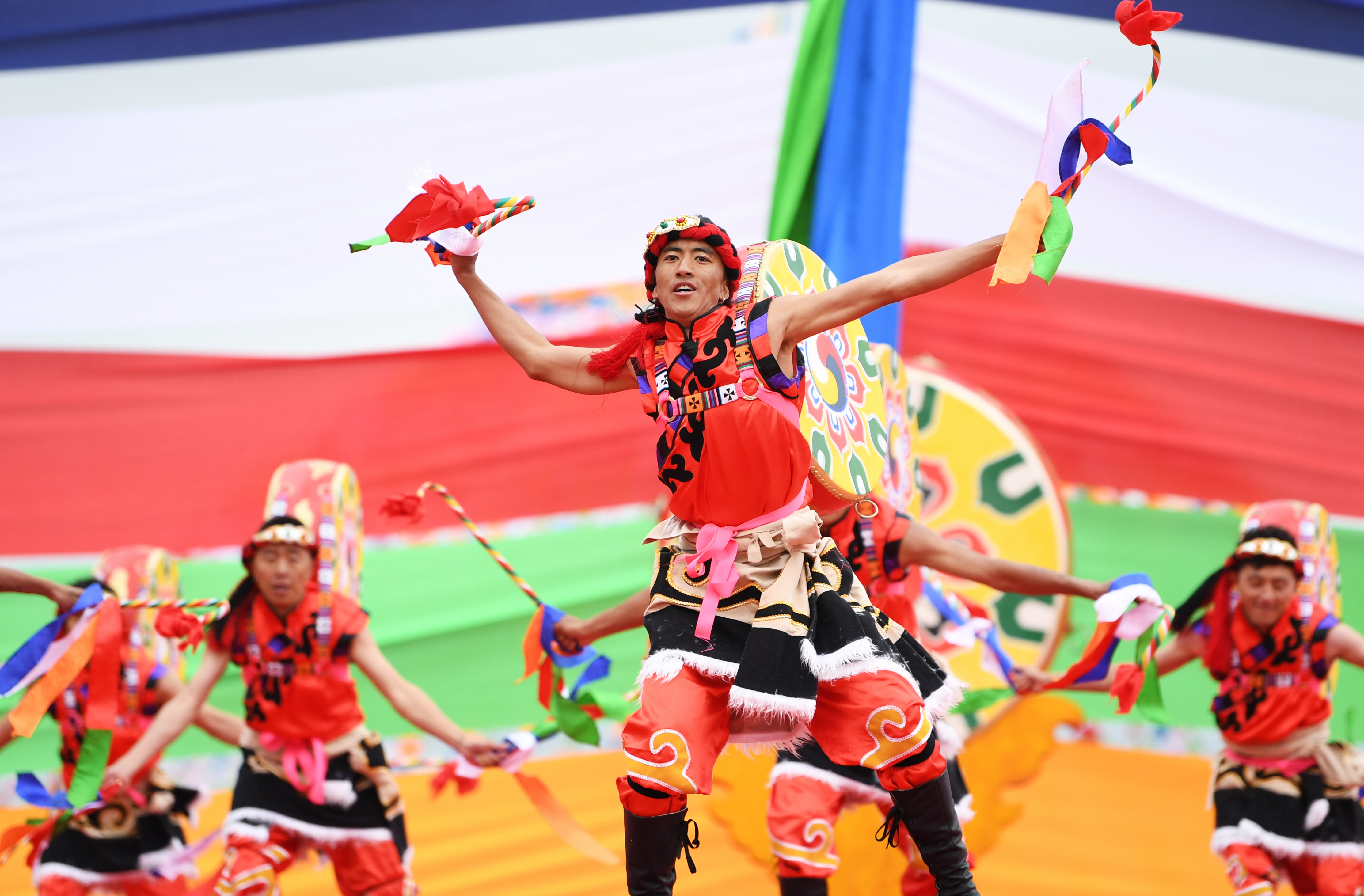 Dancers perform during the opening ceremony of the 12th Gesar horse racing festival in Maqu County, Gannan Tibetan Autonomous Prefecture, northwest China's Gansu Province, Aug. 13, 2019. (Xinhua/Chen Bin)