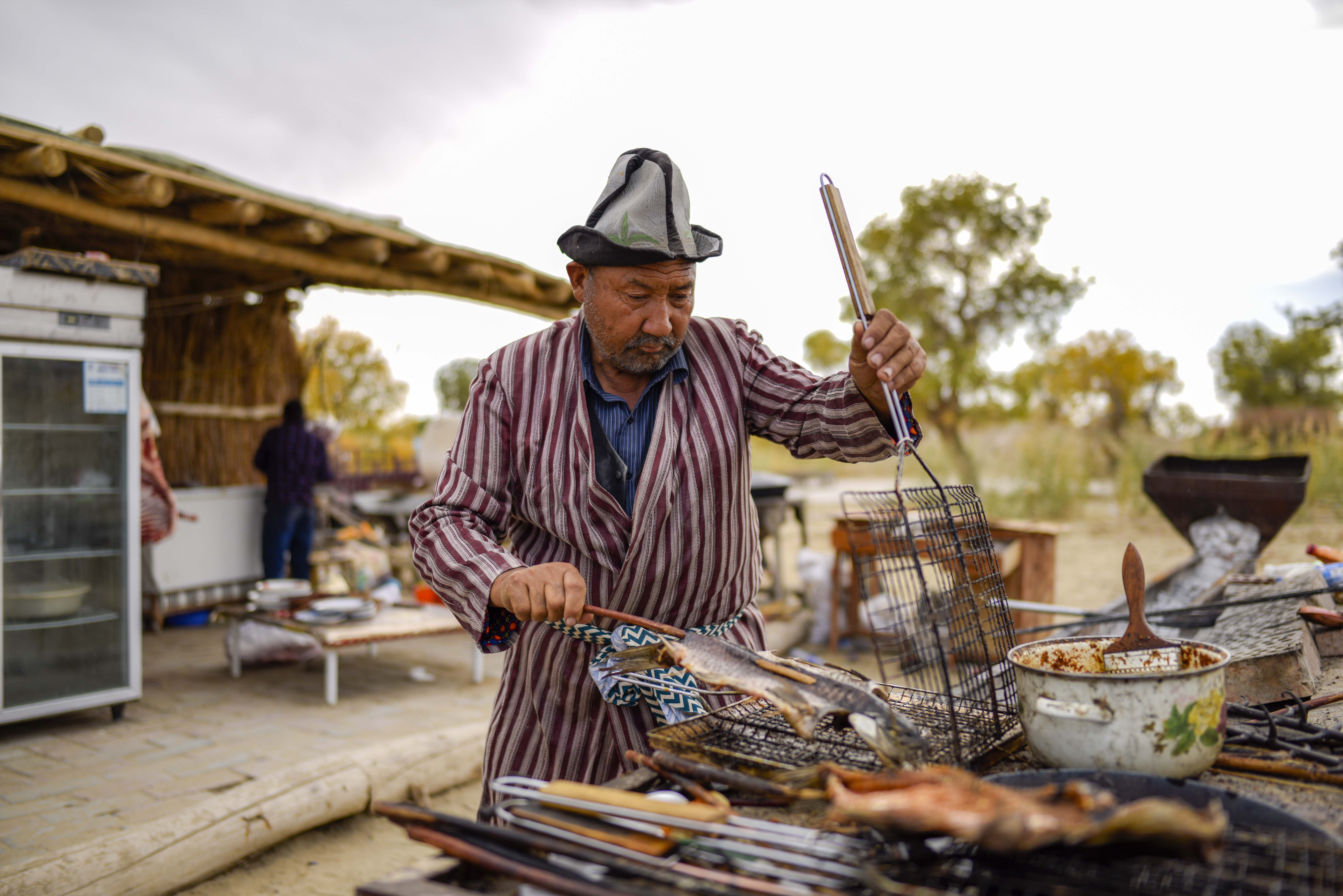 Amudun Abudu, a 61-year old typical Lop Nur villager, works in local tourism industry. With the changes of the times, many Lop Nur people have various options for a living, yet he insists on the tradition of fishing in rivers and lakes. Not only does he make delicious roast fish, Amudun also makes canoe models and pen holders made of populus euphratica trees for tourists during the tourist rush season.