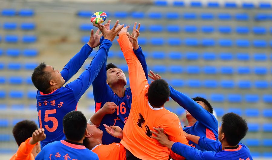 Players compete during the sparkler-grabbing game between Guangxi and Ningxia at the 11th National Traditional Games of Ethnic Minorities of the People's Republic of China in Zhengzhou, central China's Henan Province, Sept. 13, 2019. (Xinhua/Huang Xiaobang)