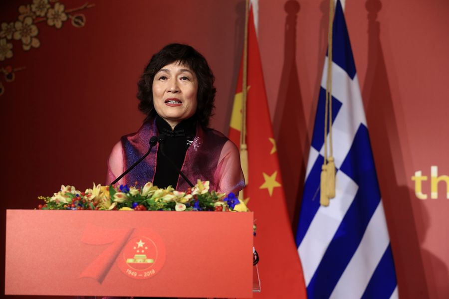 Addressing the event attended by Greek state officials, ministers and representatives of the academic, business and culture communities, Chinese Ambassador to Greece Zhang Qiyue spoke of the tremendous changes and achievements scored by China over the past seven decades, such as lifting hundreds of millions out of poverty.