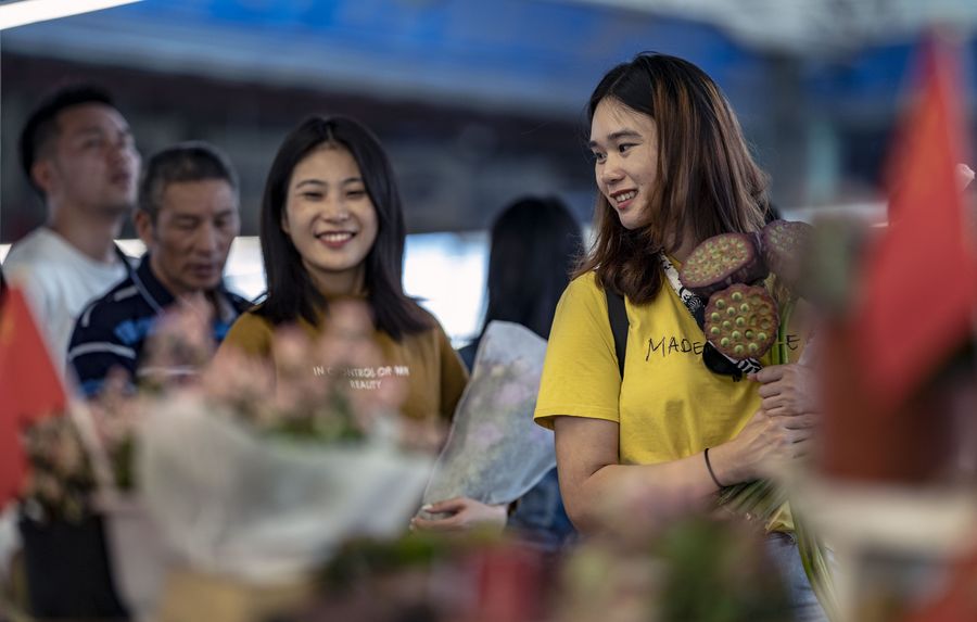Visitors choose flowers at the Dounan Flower Market in Kunming, capital of southwest China's Yunnan Province, Oct. 5, 2019. Business at Kunming Dounan Flower Market is booming during the National Day holiday. (Xinhua/Jiang Wenyao)